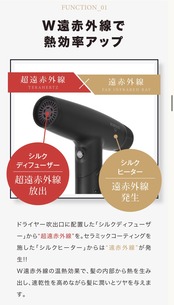業界トップクラスの超大風量&パワフルな風圧に加え、ドライヤー吹出口に搭載した「シルクディフューザー」と「シルクヒーター」から2種類の遠赤外線が発生。