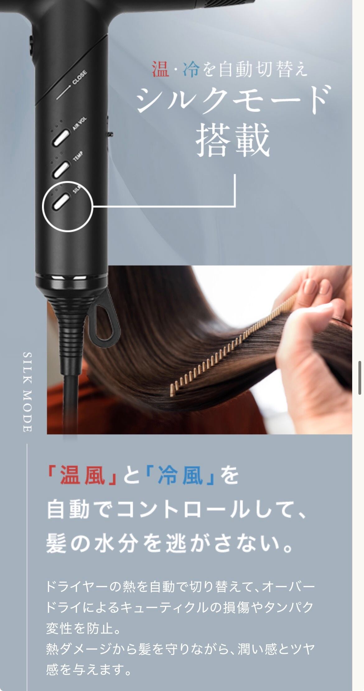 温風・冷風の自動コントロールで過乾燥を防ぎ、保湿しながら美しい髪へ導きます。