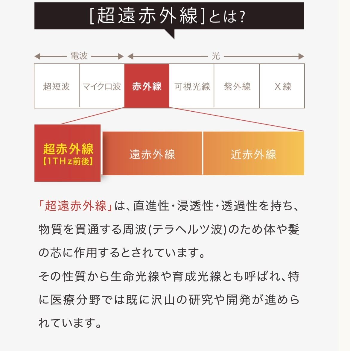 直進性・浸透性・透過性を持ち、物質を貫通する周波(テラヘルツ波)のため体や髪の芯に作用するとされています。