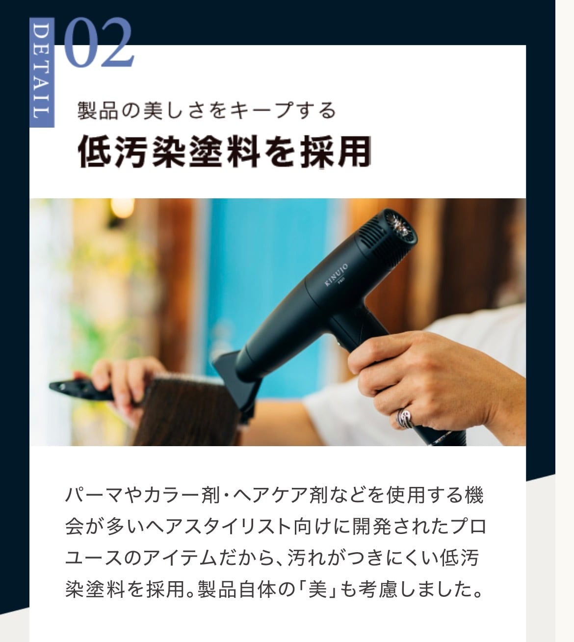 パーマやカラー剤・ヘアケア剤などを使用する機会が多いヘアスタイリスト向けに開発されたプロユースのアイテムだから、汚れがつきにくい低汚染塗料を採用。
