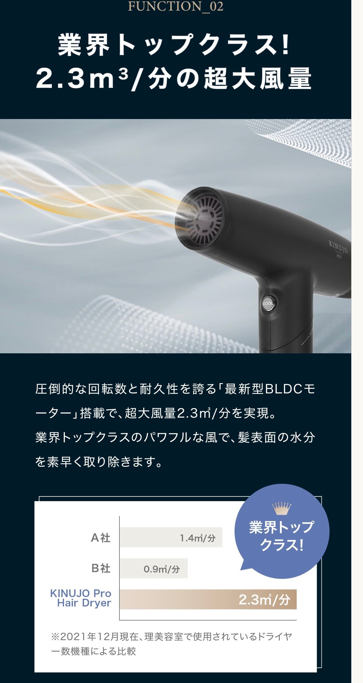 圧倒的な回転数と耐久性を誇る「最新型BLDCモーター」搭載で、超大風量を実現。