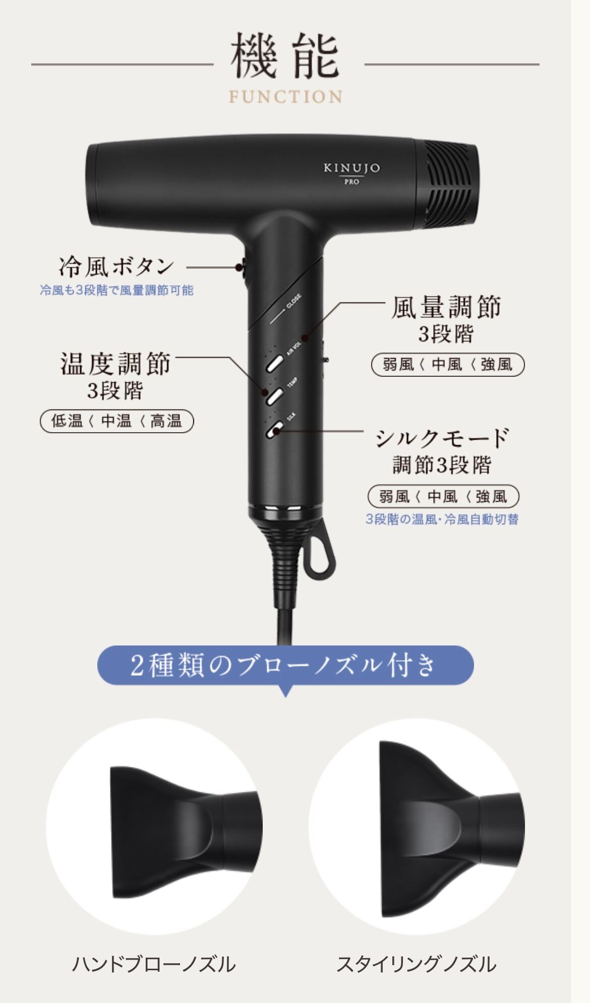 ・付属品:ハンドブローノズル、スタイリングノズル、シリコンカバー、取扱説明書(保証書付)